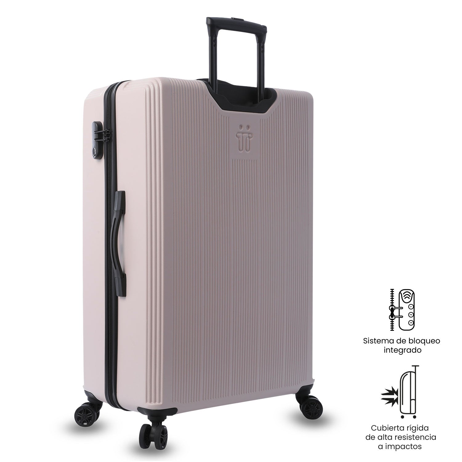 La maleta grande SKO es la opción ideal para quienes buscan resistencia y comodidad en sus viajes. Con su sistema de rotación de 4 ruedas 360°, esta maleta ofrece un desplazamiento suave y sin esfuerzo. Su estructura en un material mix de policarbonato y ABS la hace altamente resistente a impactos, protegiendo tus pertenencias. Además, cuenta con un candado de 3 dígitos para mayor seguridad, un asa telescópica ajustable y un interior optimizado con tapa en malla y correas de ajuste para mantener tus cosas organizadas. Ya sea para un viaje largo o corto, la maleta SKO es perfecta para viajar con total tranquilidad. ¡Haz que cada aventura sea más fácil y segura con la colección SKO!