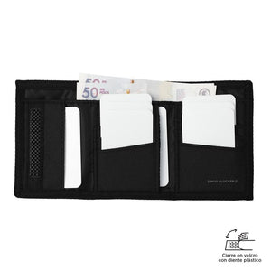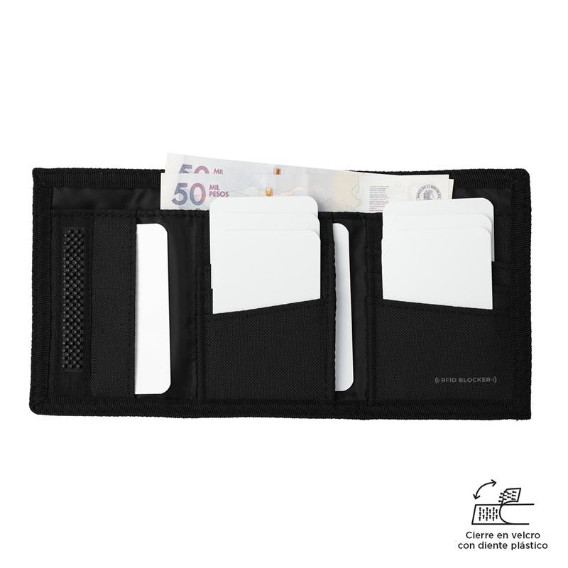 Mantén tus pertenencias seguras con la billetera Riva Mee, ideal para quienes buscan funcionalidad. Su diseño de tres cuerpos incluye espacios para tarjetas, billetes y monedas, además de una cadena con mosquetón que añade seguridad. Con cierre en velcro y sistema RFID Blocker, protege tu información personal. Fabricada en poliéster resistente, es práctica y fácil de mantener. ¡Llévala contigo y organiza todo con confianza!