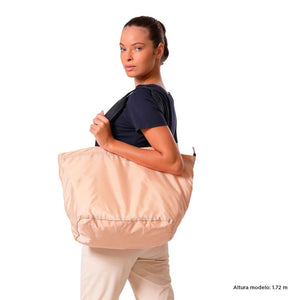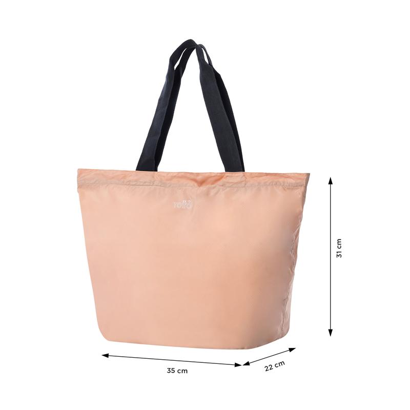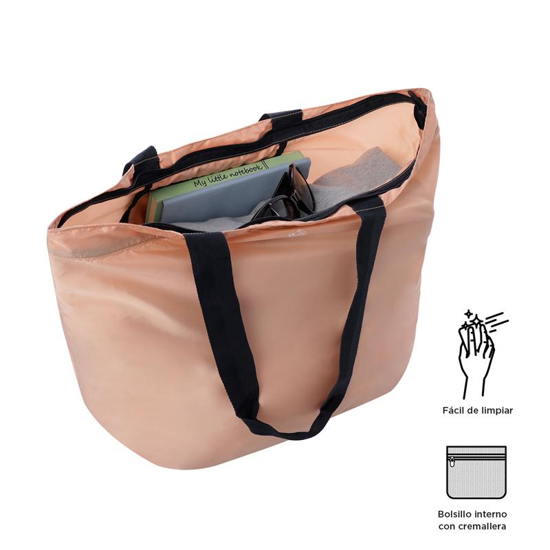 ¡Haz espacio extra en tus viajes! El bolso Ramel es un shopping plegable ultraliviano que se guarda en su propio bolsillo interno con cremallera. Fabricado en poliéster 100%, resistente y fácil de limpiar, es un complemento compacto pensado para ropa, accesorios o compras inesperadas. Su material sin estructura rígida lo hace ligero, práctico y fácil de limpiar, aunque no apto para objetos pesados. ¡Llévalo siempre contigo!