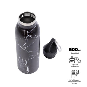 Botellón metálico en acero inoxidable, de doble pared; conserva la temperatura de las bebidas frío o calor hasta por doce horas, dependiendo de la condición climática en la que se encuentre. El diseño de la tapa plástica permite llevarlo con facilidad, además tiene un mosquetón para anclarlo a la maleta o bolso.