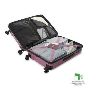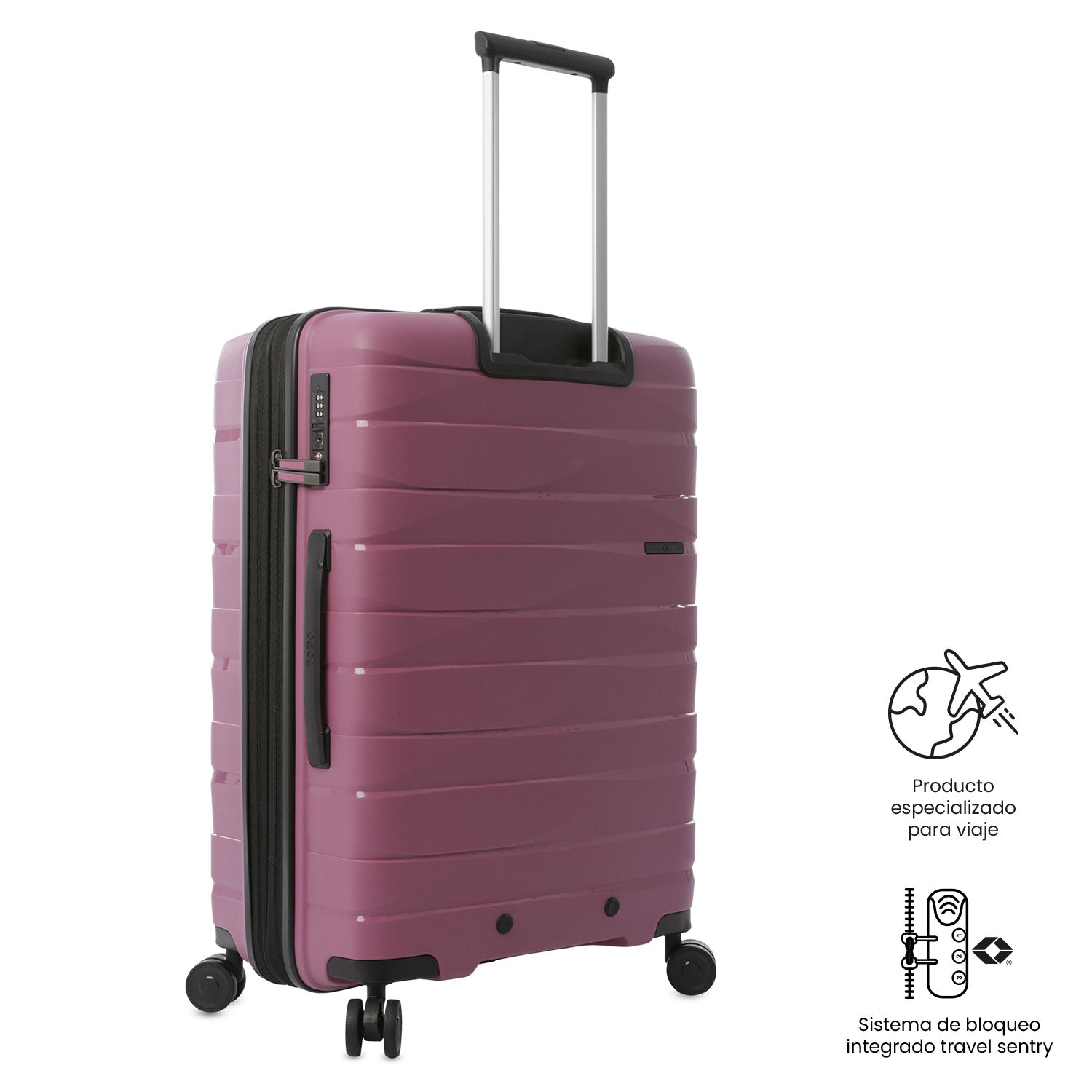 La maleta mediana Glide M combina resistencia, comodidad y tecnología pensada para los viajeros frecuentes. Fabricada en polipropileno y policarbonato, ofrece una carcasa rígida de alta resistencia a impactos que protege tus pertenencias en todo momento. Su sistema de ruedas dobles de 360º garantiza un desplazamiento suave y estable en cualquier superficie, mientras que la manija telescópica ajustable facilita la movilidad. Diseñada para adaptarse a tus necesidades, incluye correas de compresión internas para mantener todo en orden, opción expandible para ganar espacio adicional y sistema Travel Sentry (TSA) que permite un cierre seguro y homologado para controles aeroportuarios. Su interior cuenta con forro RPET elaborado a partir de botellas plásticas recicladas, reafirmando el compromiso sostenible con el medioambiente. Con medidas de 45.7 x 62 x 28 cm y una capacidad de 68,6 L, es la opción ideal para viajes de varios días, ofreciendo seguridad y practicidad en un formato compacto.