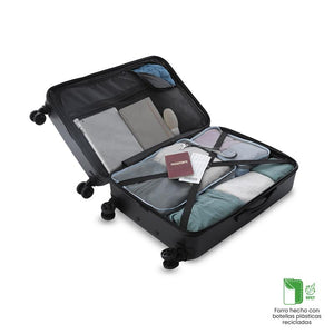 La maleta mediana Helios M 2.0 está diseñada para ofrecer máxima protección y comodidad en tus desplazamientos. Fabricada en una combinación de policarbonato y ABS, su carcasa rígida garantiza una alta resistencia frente a impactos, manteniendo tus pertenencias seguras en todo momento. Su sistema de ruedas dobles de 360 asegura una movilidad ágil y fluida en cualquier dirección, mientras que la manija telescópica ajustable proporciona un manejo cómodo. En el interior, incorpora correas de compresión que ayudan a organizar y mantener el contenido en su sitio durante el viaje. Además, cuenta con el sistema de seguridad Travel Sentry (TSA), que permite un cierre homologado para controles de aduanas sin riesgo de dañar la maleta. El forro interno está confeccionado en poliéster 100% con acabado RPET, elaborado a partir de botellas plásticas recicladas, aportando una opción sostenible a tus viajes. Con unas medidas de 42.3 x 60.2 x 24 cm y una capacidad de 74 L, es una opción práctica y compacta para viajes de varios días, donde se busca combinar resistencia, ligereza y diseño contemporáneo.