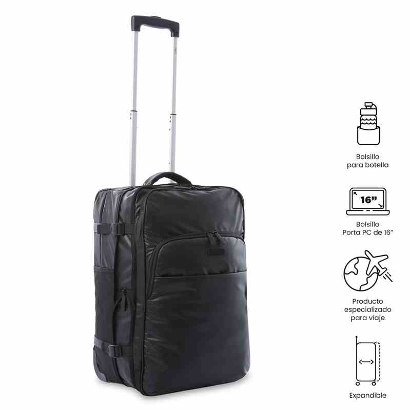 La maleta de viaje Trip S es un equipaje de cabina práctico, resistente y diseñado para hacer que tus desplazamientos sean más cómodos. Con una capacidad de 34,99 litros y unas dimensiones de 34 × 52,5 × 21 cm, se adapta a la mayoría de aerolíneas como maleta de mano, ideal para viajes cortos o escapadas de fin de semana. Pensada para maximizar la organización, incorpora un bolsillo porta PC de hasta 16”, perfecto para transportar tu ordenador de forma segura, además de correas de compresión internas que mantienen la ropa y accesorios en su sitio durante el viaje. También cuenta con un bolsillo lateral para botella y un identificador de equipaje integrado, que facilita el reconocimiento en aeropuertos. Su diseño funcional se completa con un sistema de ruedas de alta movilidad y manija lateral reforzada que aportan comodidad en el traslado. Además, su estructura es expandible, lo que permite aumentar el espacio de almacenamiento cuando más lo necesites, y una práctica ranura en la manija superior para colgar elementos adicionales. Fabricada en un 95% de poliéster y 5% de policloruro de vinilo, con forro interior 100% poliéster reciclado (RPET) proveniente de botellas plásticas, esta maleta combina resistencia, ligereza y compromiso con la sostenibilidad.