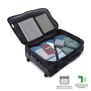 La maleta de viaje Trip S es un equipaje de cabina práctico, resistente y diseñado para hacer que tus desplazamientos sean más cómodos. Con una capacidad de 34,99 litros y unas dimensiones de 34 × 52,5 × 21 cm, se adapta a la mayoría de aerolíneas como maleta de mano, ideal para viajes cortos o escapadas de fin de semana. Pensada para maximizar la organización, incorpora un bolsillo porta PC de hasta 16”, perfecto para transportar tu ordenador de forma segura, además de correas de compresión internas que mantienen la ropa y accesorios en su sitio durante el viaje. También cuenta con un bolsillo lateral para botella y un identificador de equipaje integrado, que facilita el reconocimiento en aeropuertos. Su diseño funcional se completa con un sistema de ruedas de alta movilidad y manija lateral reforzada que aportan comodidad en el traslado. Además, su estructura es expandible, lo que permite aumentar el espacio de almacenamiento cuando más lo necesites, y una práctica ranura en la manija superior para colgar elementos adicionales. Fabricada en un 95% de poliéster y 5% de policloruro de vinilo, con forro interior 100% poliéster reciclado (RPET) proveniente de botellas plásticas, esta maleta combina resistencia, ligereza y compromiso con la sostenibilidad.