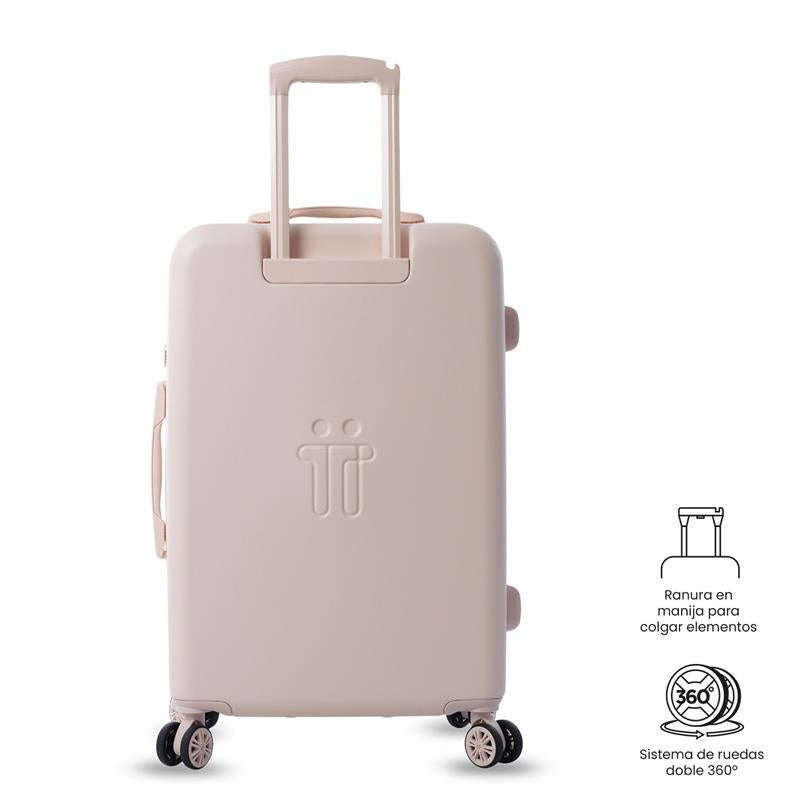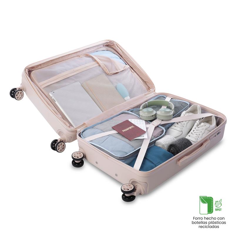 ¡Viaja mejor! La maleta de viaje Bazy+ 2.0 mediana está pensada para bodega, con ruedas 360 de última tecnología (8 ruedas) que facilitan el desplazamiento. Su estructura rígida con textura única, sistema expandible, organizador interno, separador y forro en material RPET permiten empacar con orden. Incluye candado de seguridad TSA. Si vas a registrarla, valida sus medidas con tu aerolínea. ¡Hazla parte del trayecto!
