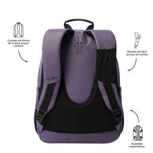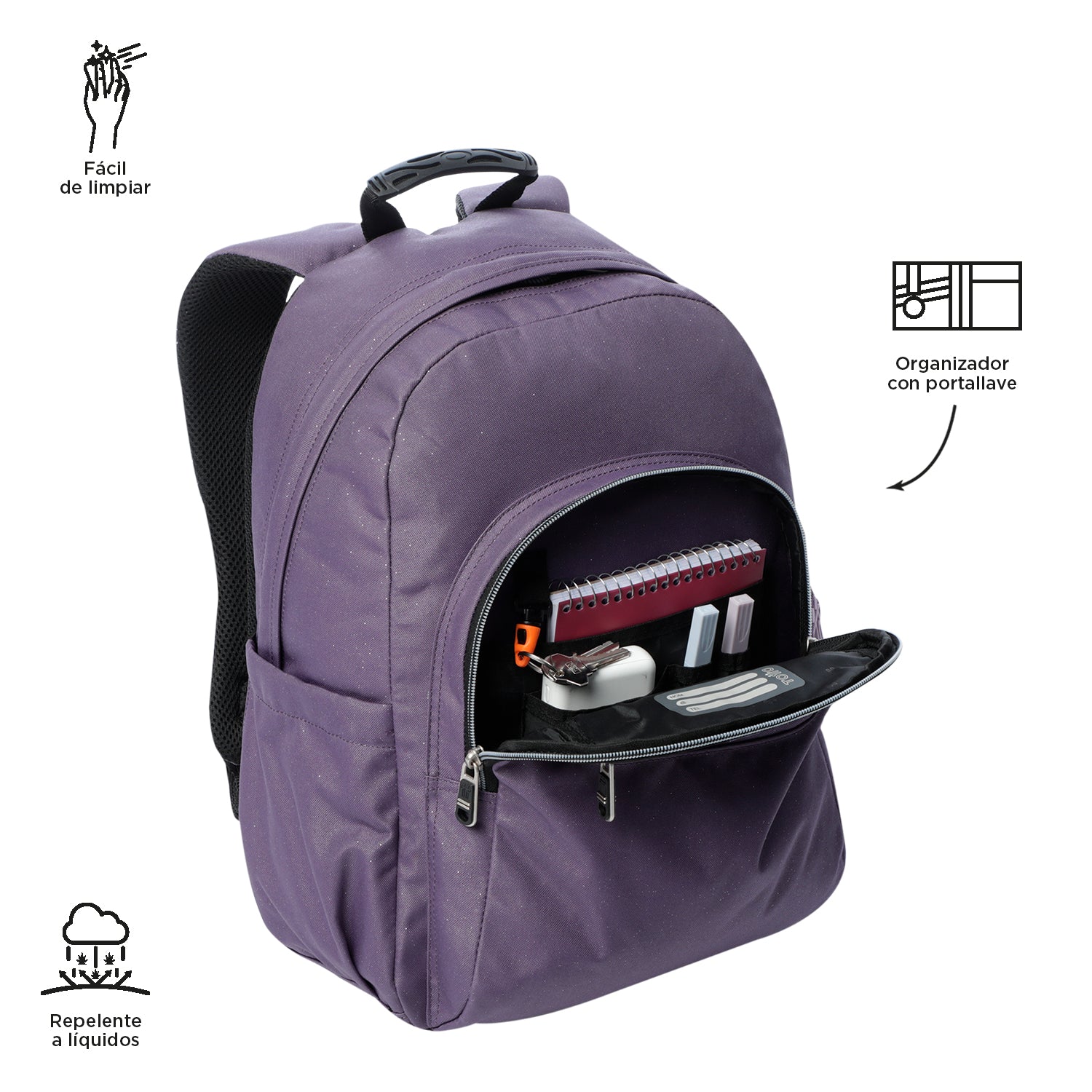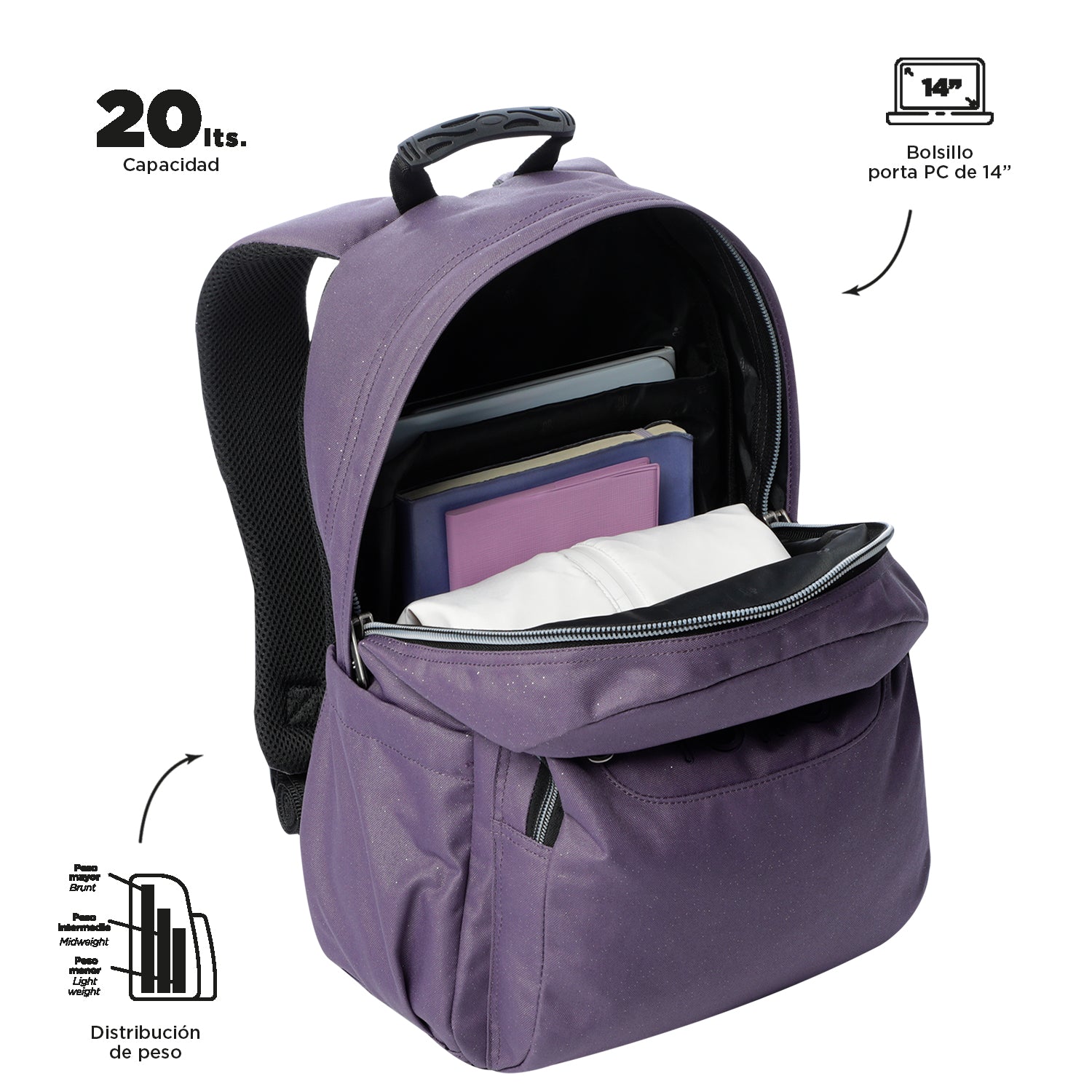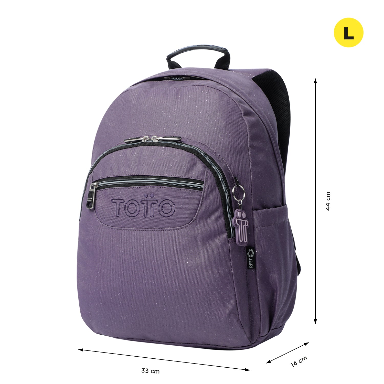 ¡No te quedes sin el tuyo! Mochila grande con acabado glitter es ideal para llevar tu portátil de 14". Fabricado con material reciclado de 10 botellas, ofrece 20 litros de capacidad, organizador con portallaves, bolsillos frontales de acceso rápido y compartimento para botella. Sus correas ergonómicas con Air Mesh, al igual que su espaldar, brindan comodidad. ¡Añádelo a tu colección hoy mismo!