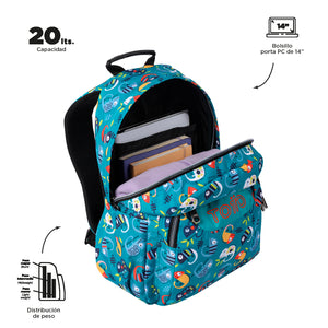 ¡Consigue tu mochila para el colegio ahora! Este morral es ideal para llevar tu portátil de 14" con total seguridad. Fabricado con lona RPET, producto de 10 botellas recicladas, tiene una capacidad de 20 litros y ofrece bolsillos frontales de acceso rápido, organizador con porta llave, compartimento para botella y correas ergonómicas con Air Mesh que aseguran mayor comodidad. ¡Perfecto para tu día a día!