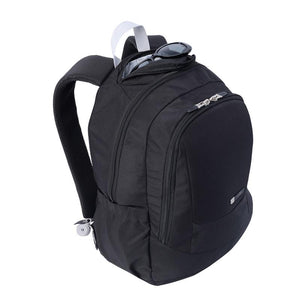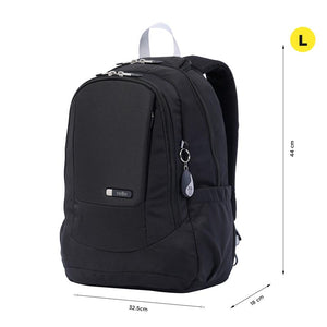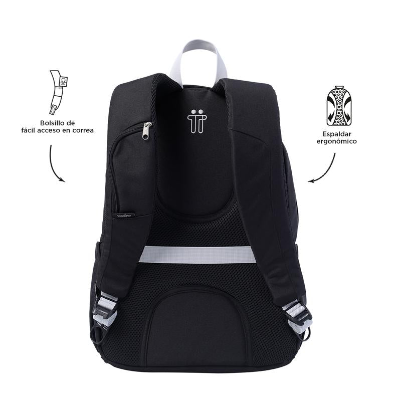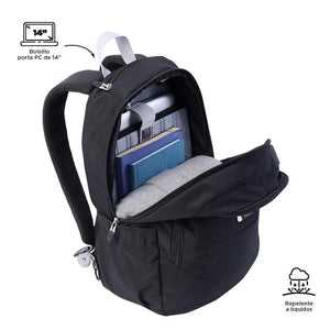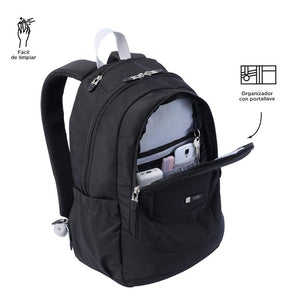 La mochila negra unisex para oficina es esencial para profesionales. Con lona resistente, protege tu portátil de 14". Dispone de organizador interno con portallaves y pasador para ruedas. Bolsillo para botella, cierre en cremallera en la correa y vertical de acceso rápido en el frontal. Correas ergonómicas con Airmesh para mayor comodidad. Hecho con poliéster 100% en exterior y forro, fusiona resistencia y estilo.