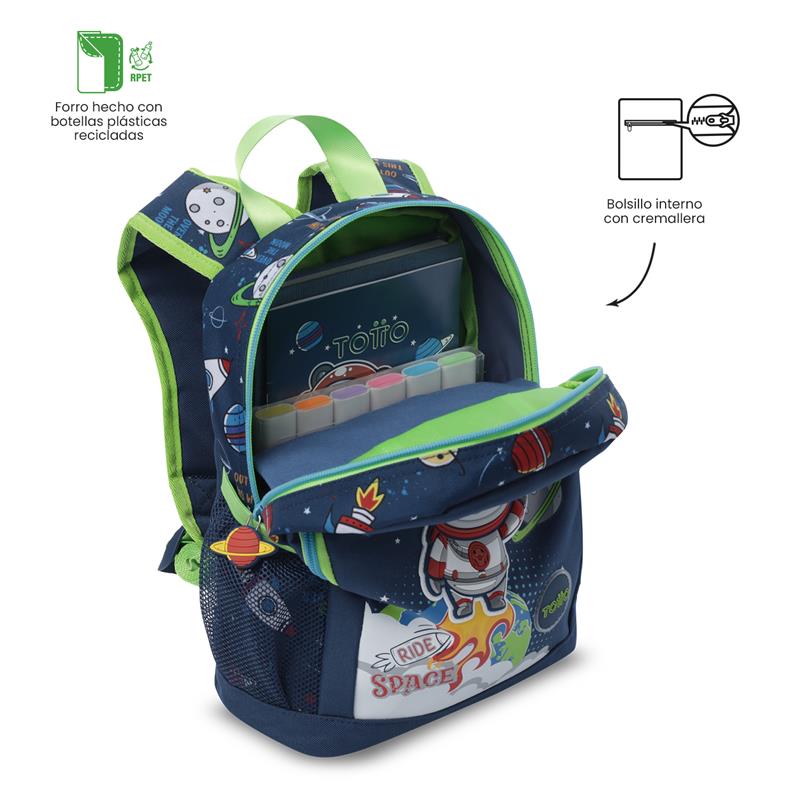 ¡Haz que cada día en el colegio sea divertido con la mochila Panda Space! Esta mochila para niño cuenta con compartimento principal con doble cremallera, bolsillos laterales porta botellas, correas acolchadas ajustables y manija superior en reata. Incluye llavero en goma de nave espacial que funciona como títere y un libro para colorear. Además, su forro RPET hecho con botellas recicladas la hace más amigable con el planeta. ¡Añádela al carrito!
