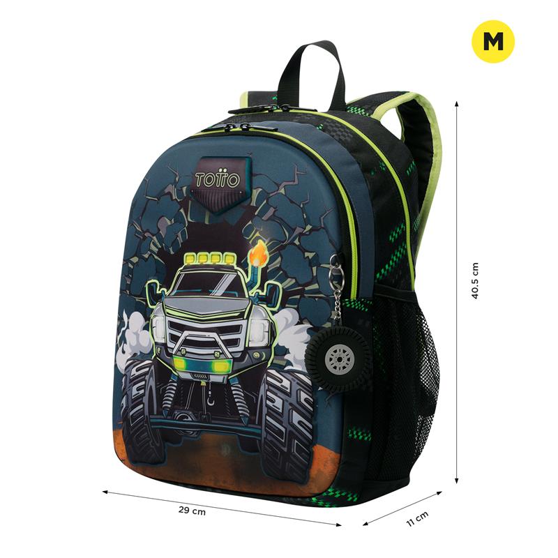 Dale un toque de acción a sus días escolares con la mochila Monster Race! Confeccionado en poliéster, destaca por su frente termoformado que le da un diseño resistente y atractivo. Incluye un compartimiento principal con doble cremallera, bolsillos laterales porta botellas y un bolsillo frontal con organizador. Sus correas acolchadas ajustables y la manija superior en reata garantizan comodidad. ¡Incluye un llamativo llavero en forma de llanta!
