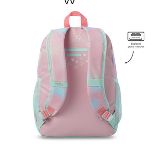 ¡Haz que cada día escolar sea especial! Esta mochila Rainbow Star combina diversión y funcionalidad: compartimento principal con doble cremallera, bolsillos porta botellas, correas acolchadas ajustables y manija superior. Forro RPET hecho con botellas recicladas y llavero en goma interactivo en forma de nube con arcoíris completan un accesorio práctico y llamativo.