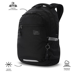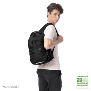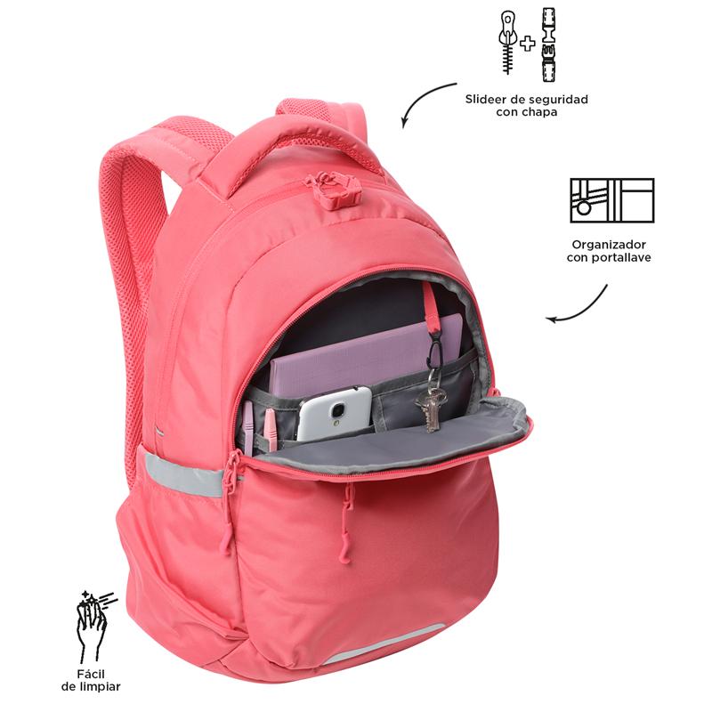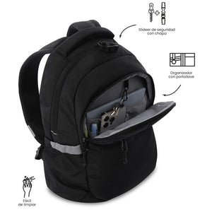 ¡Organiza tus días con la mochila para portátil Misisipi! Esta mochila juvenil, fabricada con 23 botellas recicladas, incluye compartimento para PC de 14 pulgadas y porta tableta de 10". Su diseño ofrece bolsillos para celular y botella, un bolsillo secreto, y cortes reflectivos. Con un deslizador de seguridad con chapa en el bolsillo principal, argolla para candado, espaldar ergonómico y organizador con portallaves.