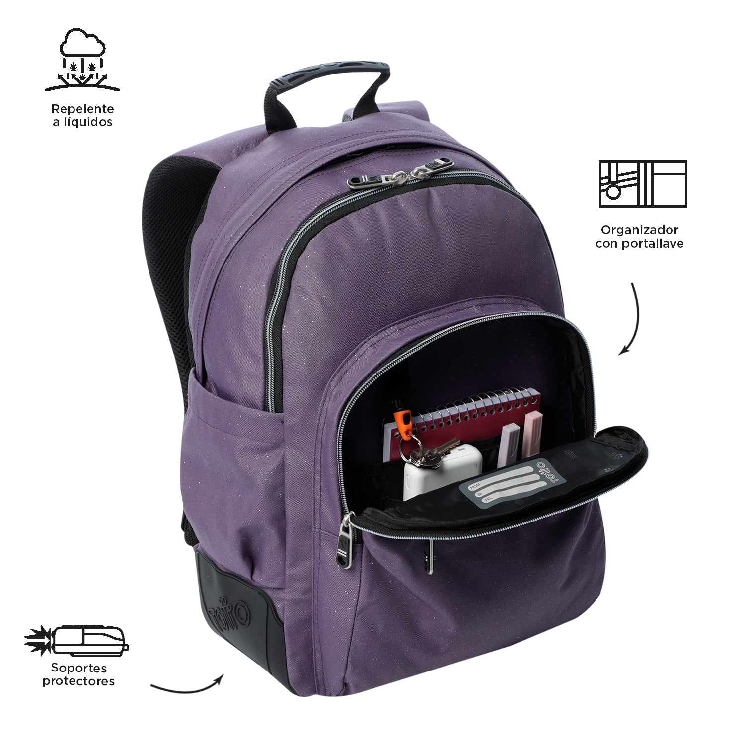 ¡Lleva el brillo a tus días con la mochila juvenil Rayol Glitter! Este modelo con acabado glitter, diseñado para mujeres, está fabricado con lona RPET de 10 botellas recicladas. Tiene un compartimiento porta PC de 14" y una capacidad de 20 litros. Incluye un organizador con portallaves, bolsillos laterales, y soportes protectores en PVC. Sus bolsillos frontales de acceso rápido y correas ergonómicas con airmesh ofrecen comodidad.