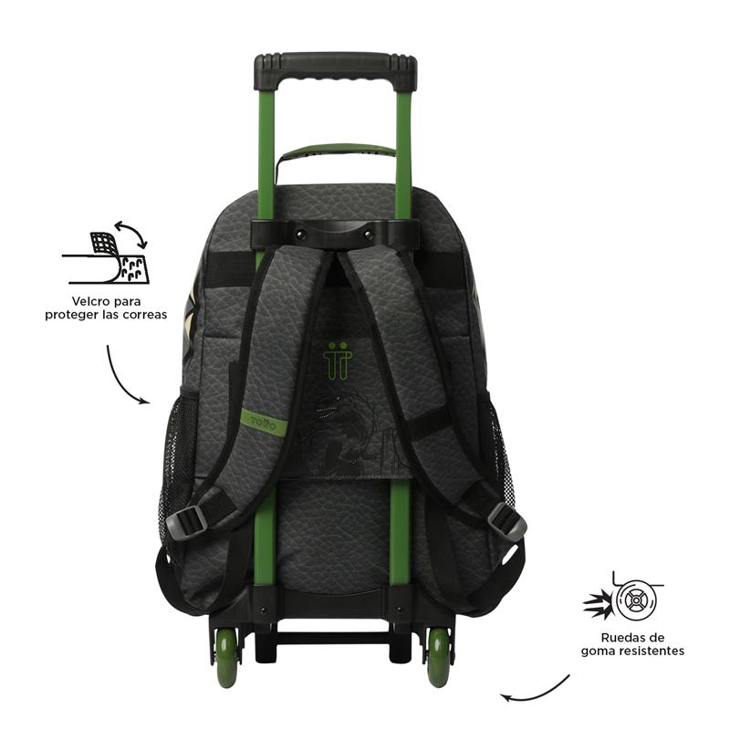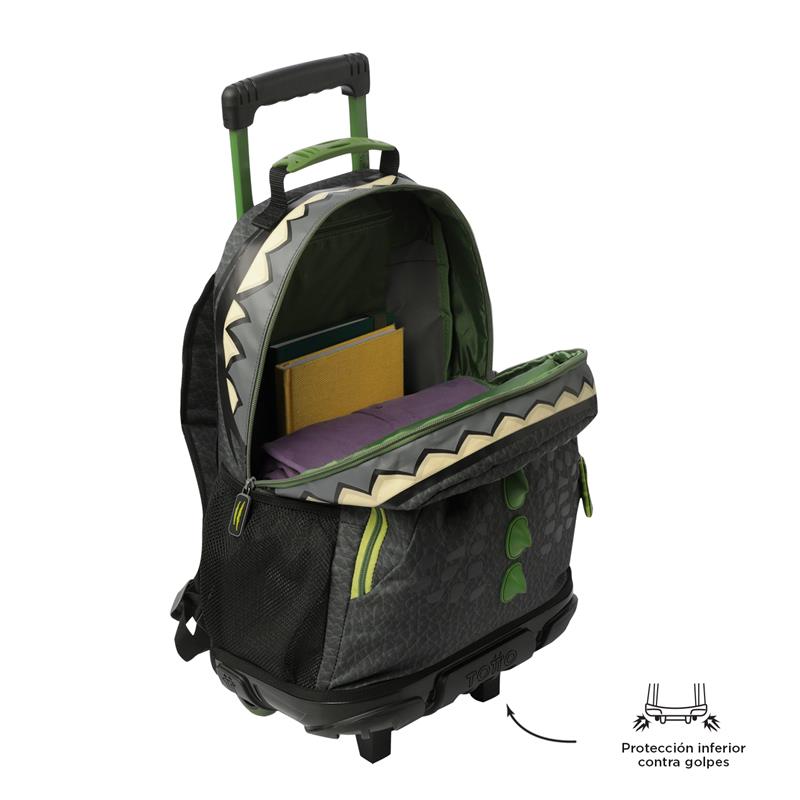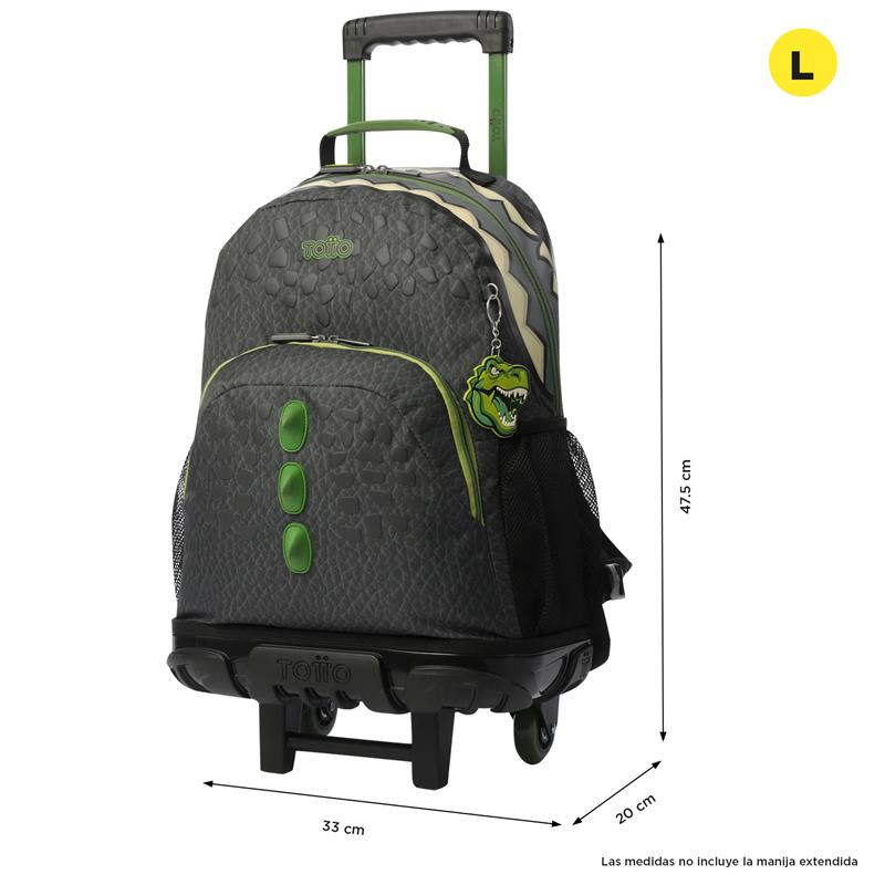 Descubre la Mochila Escolar Grande para Niño TOTTO Dinoland L, con diseño de dinosaurio, capacidad de 31 L y sistema de ruedas resistentes para facilitar el transporte. Fabricada en poliéster duradero, incluye compartimento principal amplio, bolsillo frontal organizador y laterales para botella. Perfecta para llevar libros y útiles escolares con comodidad y estilo.