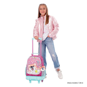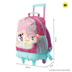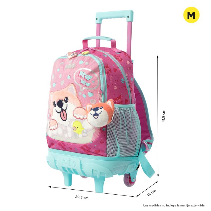 ¡Doggy Love, la ternura en cada detalle! Diseñada para niñas de hasta 8 años, esta colección inspira alegría con su adorable perrito en peluche junto a su patito de hule, rodeado de burbujas. Con tonos rosa y azul en contraste y destellos iridiscentes con escarcha en el frente. Esta mochila de ruedas mediana, confeccionada en poliéster, cuenta con un compartimiento principal con cierre en doble cremallera, ofreciendo un fácil acceso y seguridad. Sus correas acolchadas ajustables para los hombros y el asa superior en reata aseguran comodidad en el transporte. Además, tiene bolsillos laterales porta botellas y un bolsillo frontal con cierre en cremallera que incluye organizador para mantener todo en orden. Además, trae un divertido llavero tipo pom pom. ¡Perfecta para quienes aman los perritos y la diversión!