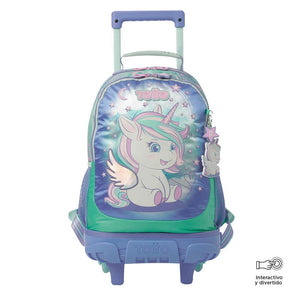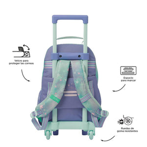 Magic Dreams, una colección mágica para las niñas que sueñan en grande. Inspirada en un tierno unicornio bebé entre las estrellas, combina los delicados tonos azul claro y verde agua marina. Esta mochila de ruedas mediana, confeccionada en poliéster con destellos iridiscentes, cuenta con un compartimiento principal con cierre en doble cremallera, ofreciendo un fácil acceso y seguridad. Sus correas acolchadas ajustables para los hombros y el asa superior en reata aseguran comodidad en el transporte. Además, tiene bolsillos laterales porta botellas y un bolsillo frontal con cierre en cremallera que incluye organizador para mantener todo en orden. Para añadir un toque único, incluye un llavero tipo pom pom. ¡Un sueño hecho realidad!