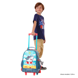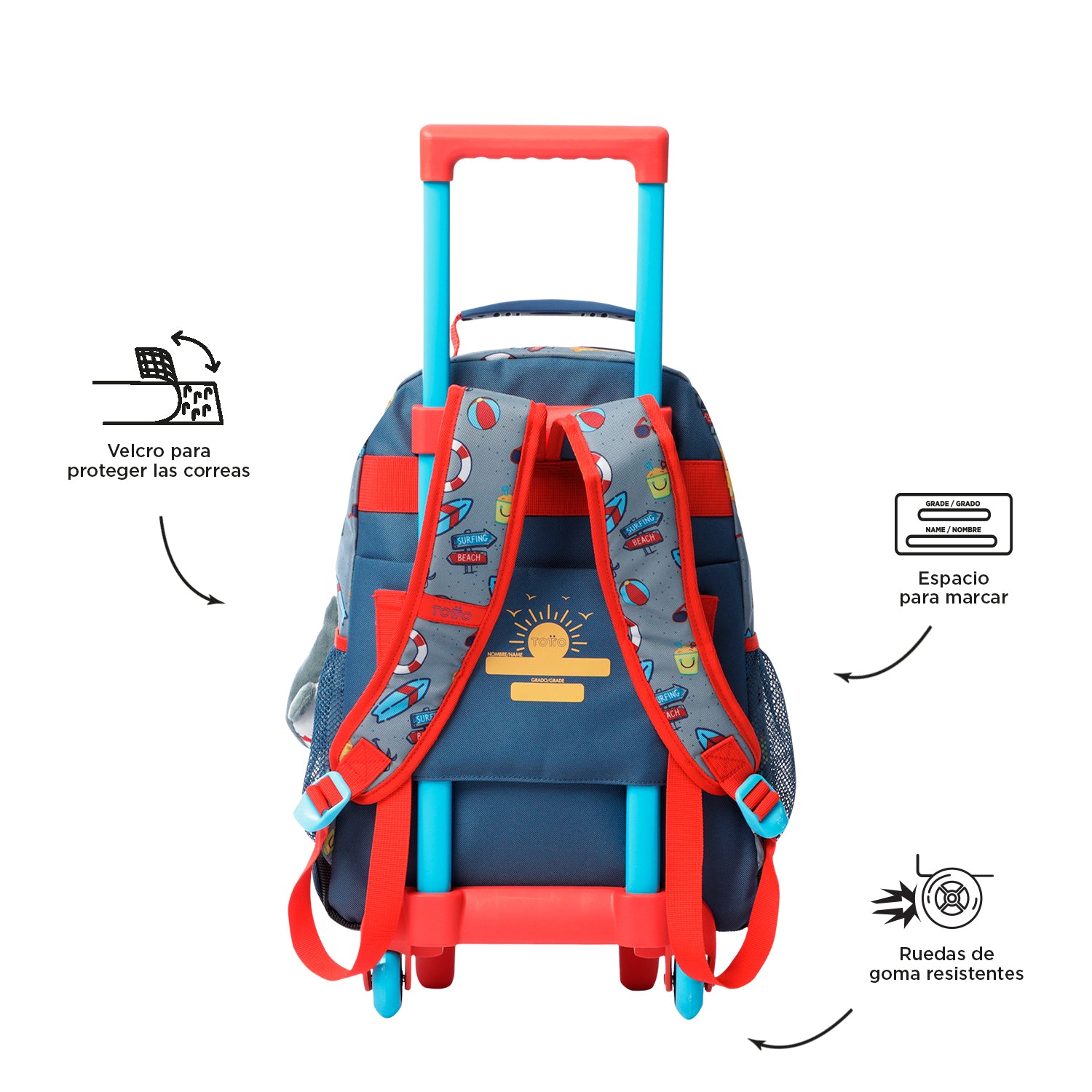 Mochila mediana con ruedas de la colección Little Surfer, diseñada para llevar la esencia de la playa a cada día escolar. Con un estampado en alta densidad en la parte frontal, presenta un compartimento principal con doble cremallera para un acceso fácil y organizado. Incluye correas acolchadas ajustables para los hombros y un asa superior para mayor comodidad. Los bolsillos laterales son ideales para botellas y el bolsillo frontal con cierre en cremallera mantiene todo a mano. Además, viene con un llavero del adorable tiburón de peluche, aportando un toque divertido y playero a cada jornada.