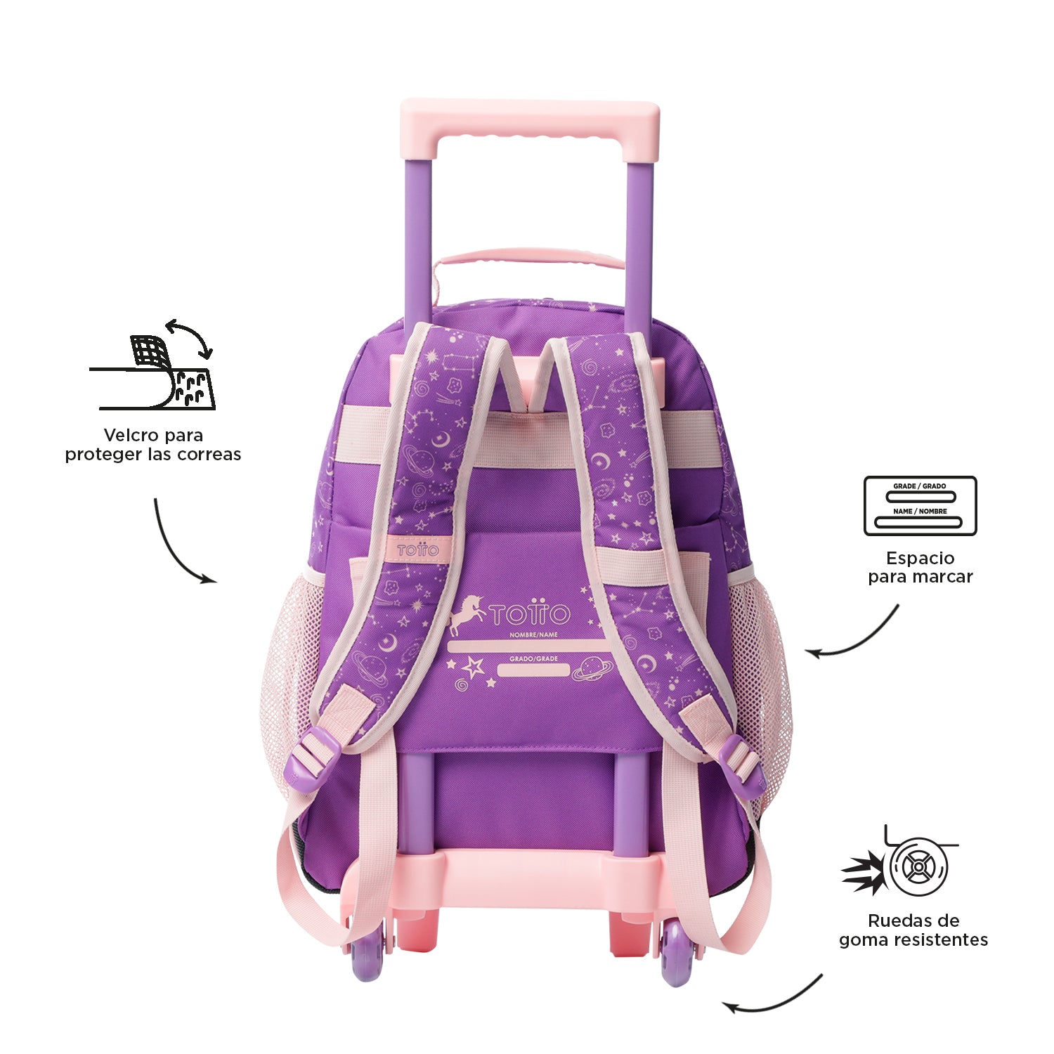 Mochila de ruedas mediana de la colección Unispace, ideal para explorar el universo con estilo. Su panel frontal en PVC presenta un diseño mágico con un unicornio viajando entre estrellas. Ofrece un compartimento principal con cierre de doble cremallera para un almacenamiento seguro, mientras que las correas acolchadas ajustables aseguran comodidad durante el uso. La manija superior en reata facilita el transporte, y los bolsillos laterales son perfectos para botellas. El bolsillo frontal con cierre en cremallera añade un acceso adicional para objetos pequeños. Completa el look con un llavero en forma de unicornio encapsulado, que aporta un toque final de encanto espacial. ¡La elección perfecta para aquellos pequeños soñadores que desean llevar un pedazo del cielo a cada aventura!