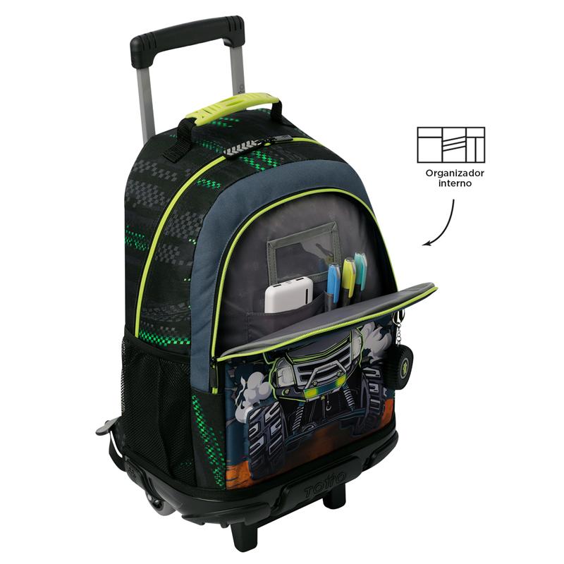 ¡Haz que sus días escolares sean más emocionantes con la mochila con ruedas Monster Race! confeccionada en poliéster cuenta con un resistente frente termoformado que le da un toque único.