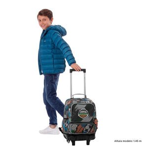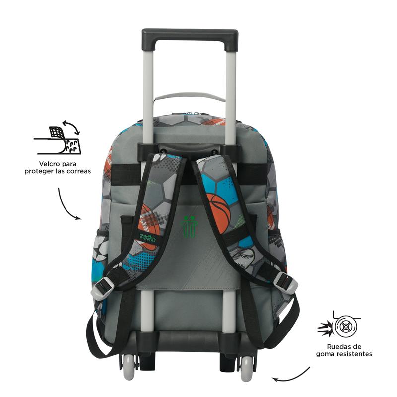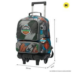 Motiva sus días escolares con la mochila con ruedas Multisport! Inspirada en el mundo del deporte, este diseño confeccionado en poliéster combina funcionalidad y estilo. Incluye un compartimiento principal con doble cremallera, dos bolsillos frontales con cierre en cremallera y bolsillos laterales porta botellas. Sus ruedas, correas acolchadas ajustables y manija superior en reata brindan comodidad. ¡Incluye un llavero de balones deportivos en goma!