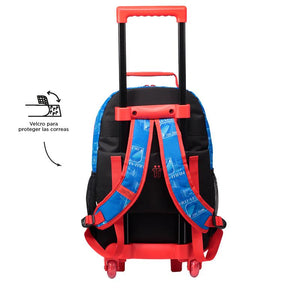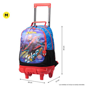 ¡Lleva todo el poder de tu superhéroe favorito al cole! El morral de ruedas mediano Spider Man cuenta con un amplio compartimiento principal con cierre en doble cremallera, correas acolchadas ajustables en los hombros para máxima comodidad, manija superior en reata, bolsillos laterales exteriores portabotellas y bolsillo frontal. Además, incluye llavero y en la parte posterior cuenta con un espacio para marcar nombre y grado.