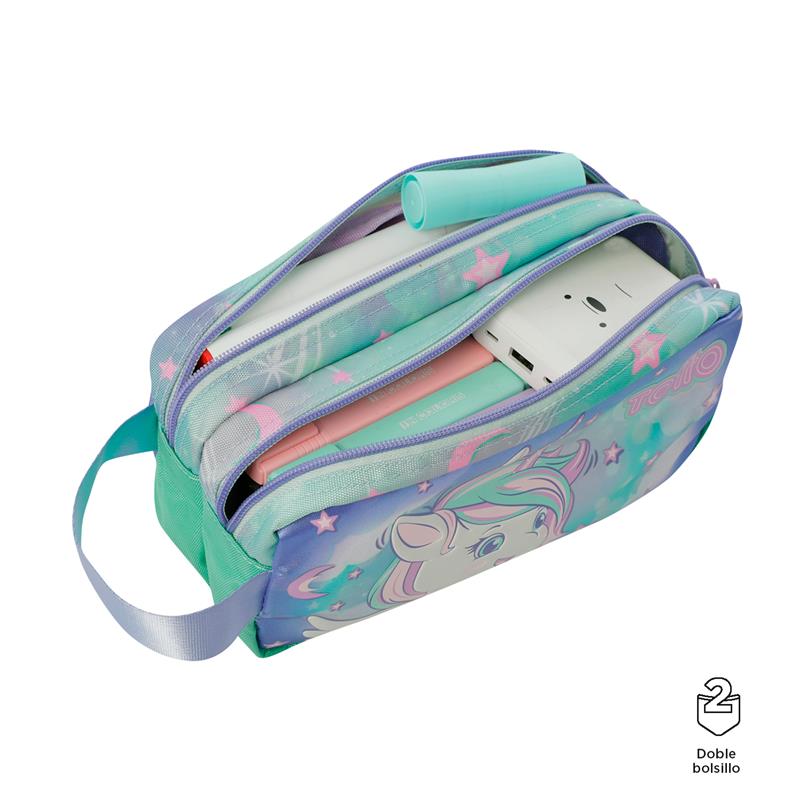 Multiuso para niña MAGIC DREAMS con doble compartimiento y cierre en cremallera, perfecta para organizar lápices, bolígrafos, marcadores y otros útiles escolares. Su diseño funcional mantiene todo organizado y accesible, mientras que el cierre en cremallera asegura la seguridad de los artículos. Incluye un espacio posterior para personalizarla con el nombre de tu hija. Además, la asa lateral permite transportarla cómodamente, ideal para la escuela y actividades extracurriculares. Hecha de material resistente, es duradera y fácil de limpiar.